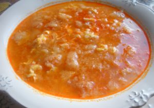 Verter agua (o el caldo), sal, el pan  y tomate frito. Cocer unos minutos y añadir el huevo al final.